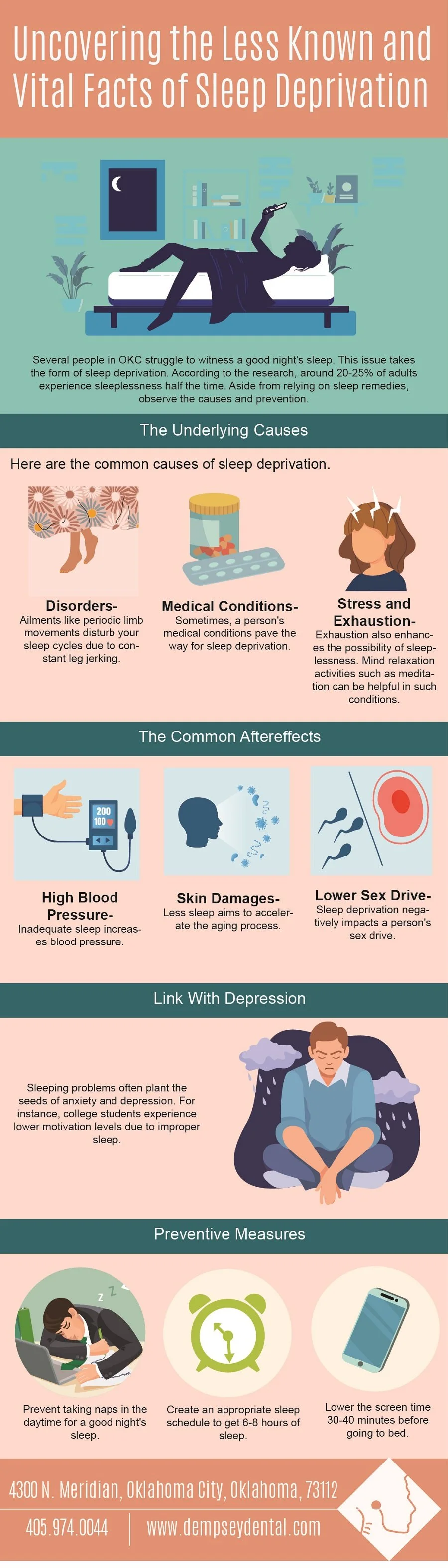 Sleep deprivation is usually a common occurrence in OKC people. These days, people are least likely to witness a deep sleep relaxation. Besides relying on the sleep remedies, you must contemplate the primary causes. Some of these include medical conditions, diseases, and stress. You must take measures such as creating a proper sleep schedule, avoiding daytime naps, and reducing screen time before sleep.