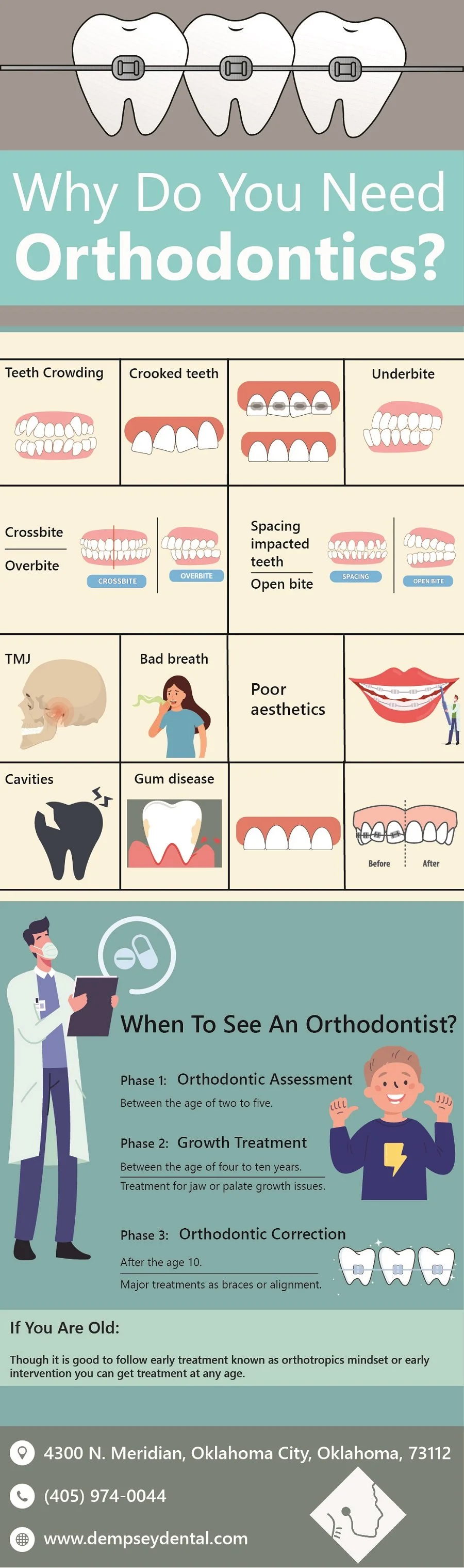 Why and when do you need an orthodontist? For the purposes such as teeth crowding, crooked teeth, underbite, overbite, crossbite, overbite, spacing impacted teeth, open bite, TMJ, bad breath, poor aesthetics, cavities, gum disease etc. For children of different age there are different phases such as orthodontic assessment, growth treatment, orthodontic correction. Though you can get this treatment at old age if that is required. For details on it, check out the infographics.